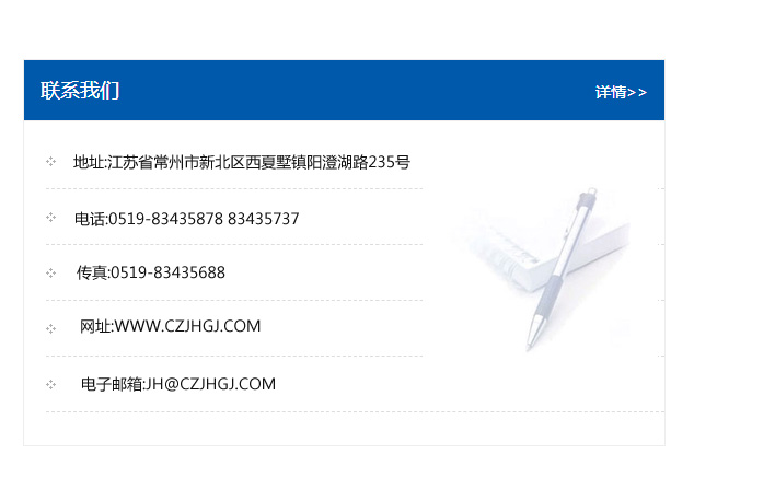 地址:常州市新北區友邦商務大廈1幢16、17層  電話:0519-85101652  傳真:0519-85112595  郵編:213022  網址:www.cz-jiayue_cn.jiayaobangong.com  郵箱:xiajifengaa@163.com